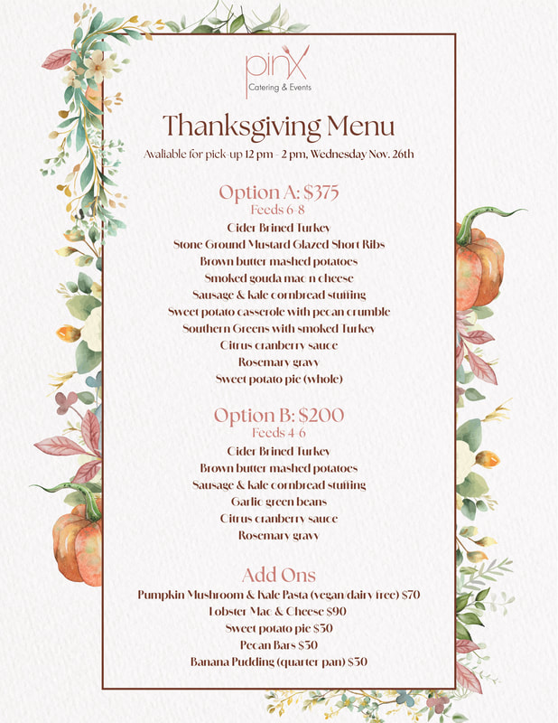 This Thanksgiving, spend less time in the kitchen and more time with the people who matter. PINX Catering brings you a fully prepared Thanksgiving feast that’s ready to reheat and serve. All the flavor, none of the hassle.